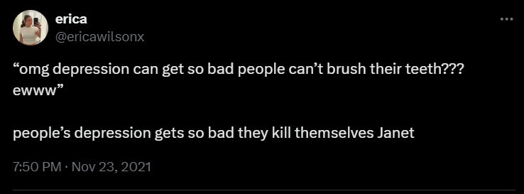 Zillah’s video is uploaded to YouTube before he makes an attempt on his life and lands himself in hospital, in a 5 day coma as his team of doctors fight to keep him alive. Zillah’s attempt, strangely enough, validated a lot of my own feelings about my mental health. Whilst reading about his attempted martyrdom, and the subsequent fallout of his friends and family feeling defeated whilst he recovered in the hospital, ‘no good alone’ by Rayne Fisher-Quann vibrated in my head. Martyrdom may not be my speed, but Zillah’s desperation isn’t unique. In Fisher-Quann’s essay, she details how modern wellness culture promotes social isolation instead of community: “…ritualistic self-punishment and pathetic martyrdom were the only ways I [she] could ever make myself worthy of other people.” This line from Fisher-Quann encapsulates Zillah, after all he literally tried to off himself in his best friend’s bathroom. Throughout the entire book it is made apparent that Zillah isn’t one for reaching out for help: when his heroin relapse started he kept it under wraps for two months before Emma found out, when he talks to his sister she retorts that she never knows what’s going on with Zillah (in fairness, as soon as he spills his guts she threatens him with hospitalisation and says he’s wasted his potential, so I don’t blame him too much…) and despite Tom’s “buddy system”, Zillah still uses secretly throughout the day. I understand Zillah. I understand feeling so fucked up that I don’t want my friends to see me, I understand the comfort of isolation when I lie to myself and say I’m “saving” my friends from myself (I implore anyone who has ever, even once, felt this way to go and read no good alone. You won’t regret it, I promise). I understand feeling suicidal and thinking it would be less burdensome on everyone around me to just remove myself from their lives. Reading on paper someone else verbalising the thoughts and feelings I have about my neurosis struck a chord in me I don’t think I can ever unhear. No good alone put the idea of actually reaching out for help in my head, and reading Zillah’s attempt hammered the nail into the coffin. Rayne Fisher-Quann puts it: “It is a cruel and fundamentally inhuman tragedy that the culture has convinced so many of us that we must be healed in isolation, because being surrounded by people — people who love us, or care for us, or are willing to sit in the same room with us while we clean up our messes — is about the only way that I, for one, have ever been able to get better.” Zillah only gets better with help from his friends and family. When he’s in hospital, they fight tooth and nail for him to get him the diamorphine and the help that he needs and deserves. I’m glad that, despite all the hurt Zillah unfairly deals with in his life, that it concludes through him getting help from someone else. Relying on community should never feel overplayed, cliché, or “not worth my time”. No one is an island, no matter how hard society and our own government pushes that narrative (see tory party members arguing that the poor should just “pull up their bootstraps”…) What I’m saying is, ask your friends to hang out for a bit instead of locking yourself in your room. Please don’t intentionally make yourself miserable because you’re too proud to accept help from others. (I love you, reader. If no one else in your life thinks you deserve help and support, I promise, I think you do. You deserve it more than anyone).